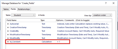Now if we create a table in FileMaker, then it will create a default fields and the calculation field with the value of “1” as default and named as “Id_Constant”.