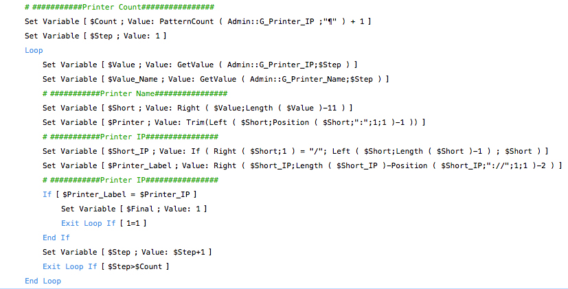 Get the list of printers IP address in the system and assign it to a field Name “G_Printer_IP” using a “Perform AppleScript” command as
