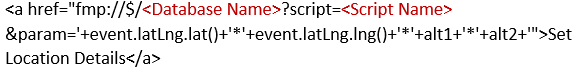 - While on Clicking the “Set Location Details”, we are retrieving the Location Information and storing the Information in Location Information Table, for that we have to create a Script to store information through Parameter and have to call the Script in JavaScript through fmp URL as follows
