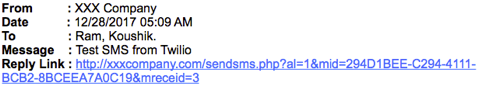 PHP Code will find the empty flag value records and perform the loop to send an SMS via Twilio with reply URL and populated the “Sent” value in flag field. Please see the message sample: